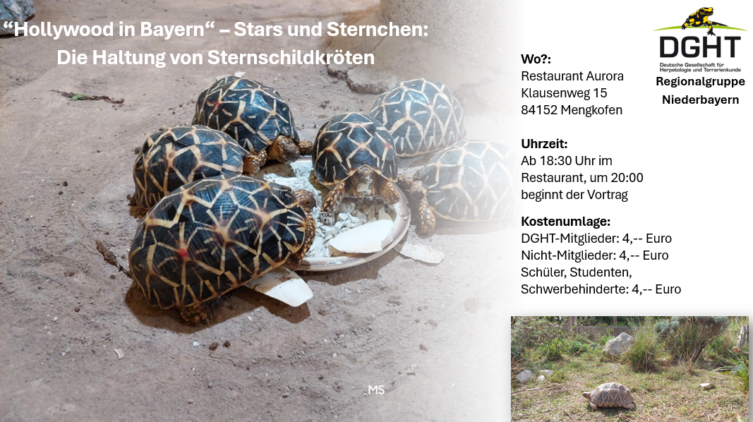 Im Mittelpunkt dieses Vortrags stehen die beeindruckenden Sternschildkröten. Anschaulich stellt er ihre Haltung, Ansprüche, Ernährung sowie Zucht vor.