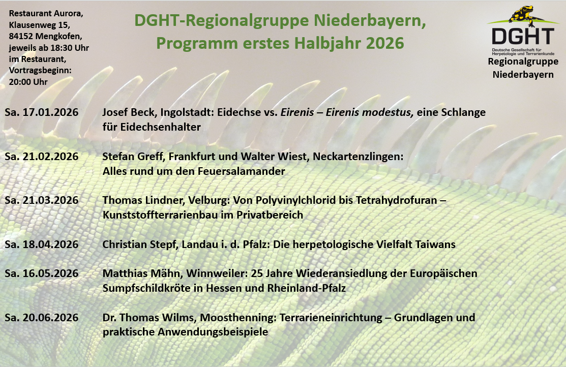 Die DGHT-Regionalgruppe Niederbayern bietet wieder ein tolles Halbjahresprogramm 2026 für alle Interessierten, die sich für Reptilien und Amphibien begeistern. Jeder ist bei uns herzlich eingeladen, unabhängig von Vorkenntnissen oder Erfahrung.