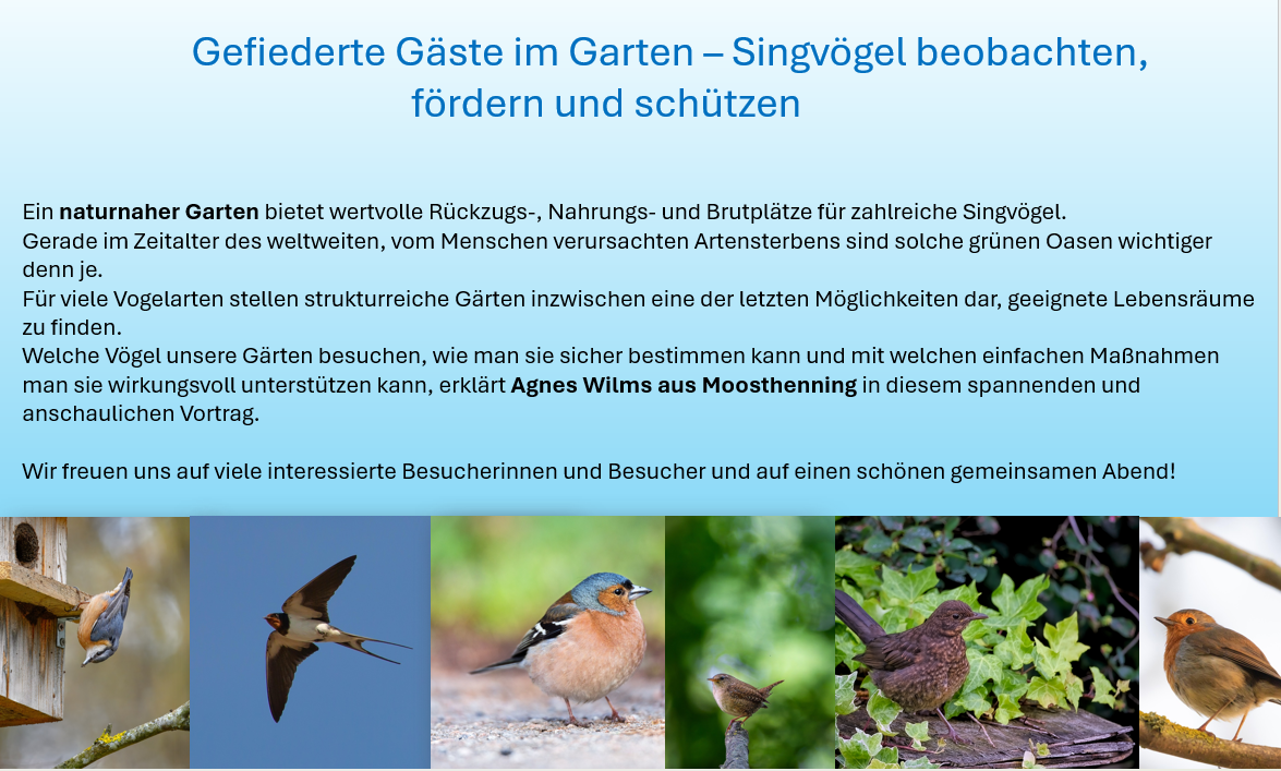 Vortrag: Gefiederte Gäste im Garten – Singvögel beobachten, fördern und schützen!