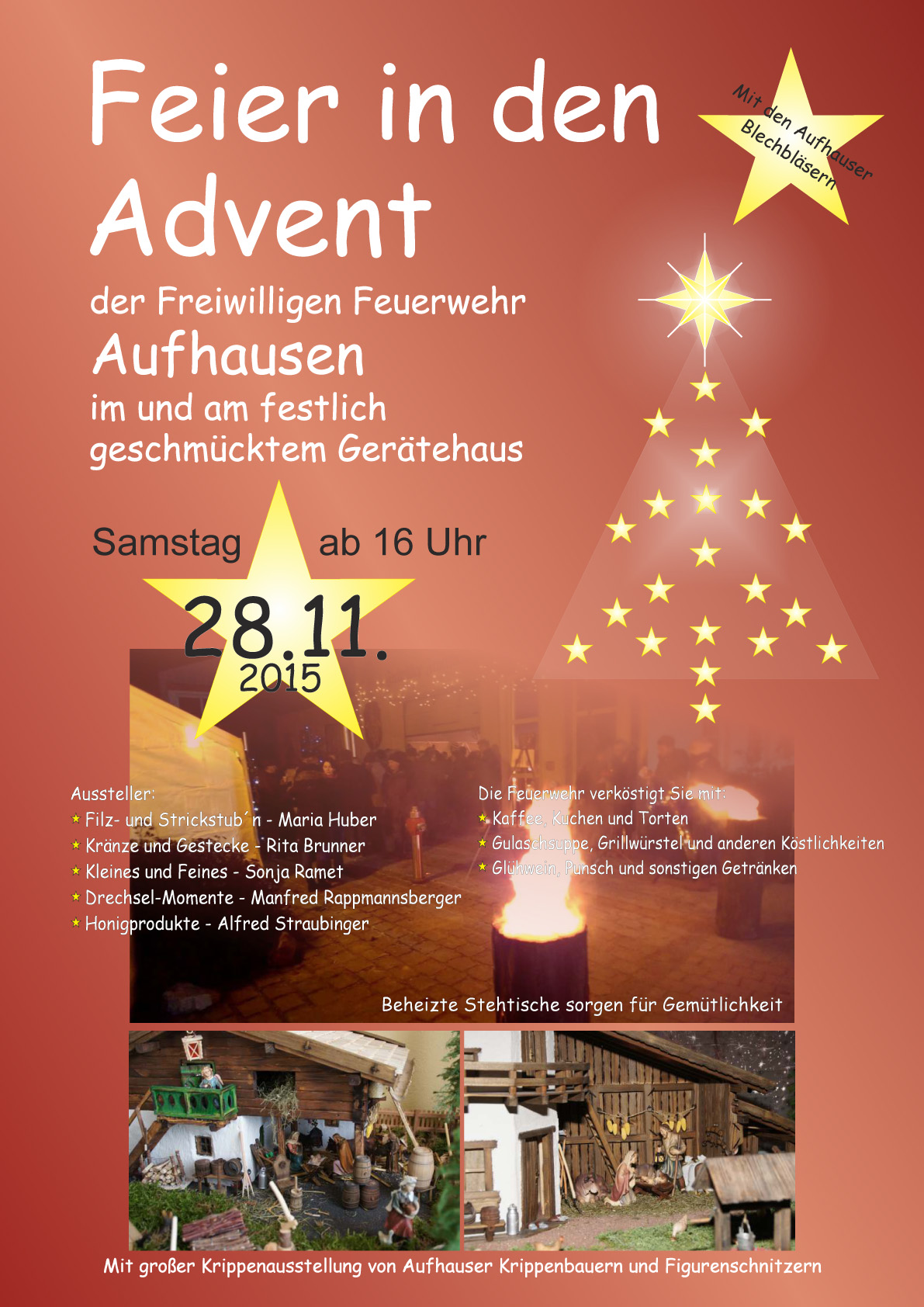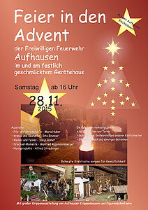 Weihnachtsmarkt der Freiwilligen Feuerwehr Aufhausen - im und um das festlich geschmückte Gerätehaus. Ein kleiner aber feiner Markt mit großer Kripperlausstellung, kleinem Markt mit heimischen Ausstellern. Trinken sie einen Glühwein an unseren beheizten Stehtischen oder machen sie Brotzeit. Natürlich sind auch Kaffee und Kuchen/Torten zu haben.